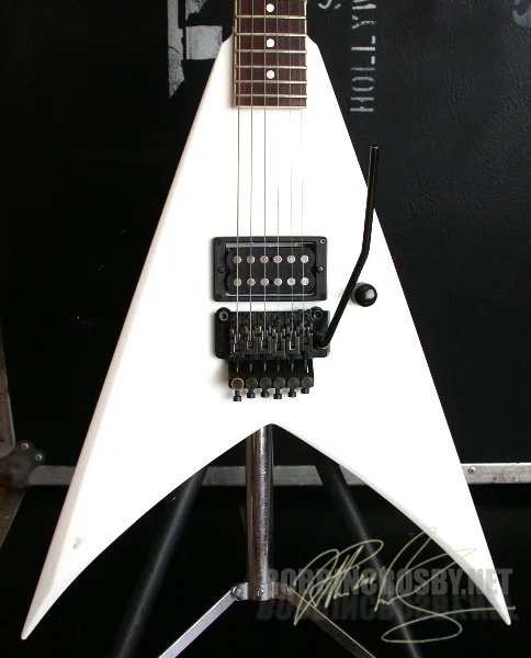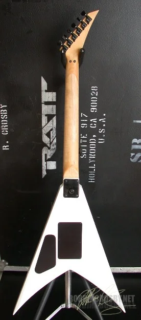 Delivered on April 18, 1988. Jackson King V Custom. White Frost finish, Original Floyd Rose trem, Tom Anderson H-3 pickup, One volume control. Unusual bound Rosewood fingerboard with dot inlay and reverse headstock. "noskcaJ" logo (upside down reverse!). Neckplate Serial #4632